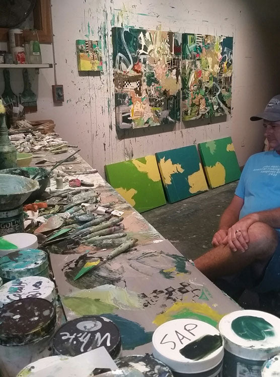 Spontaneously. My pieces are all process paintings. I’ll start them with no preconceived notion of the final image. I just dive into the canvas, get to work, and keep working. I’ll go through a developing process of adding different layers of paint, and fine-tuning the color and composition. I’ll respond to what’s happening with the paint, maybe build things up in the foreground and leave the background alone. An implied space emerges, and then I’ll continue to develop it. When the space feels complete, I stop.