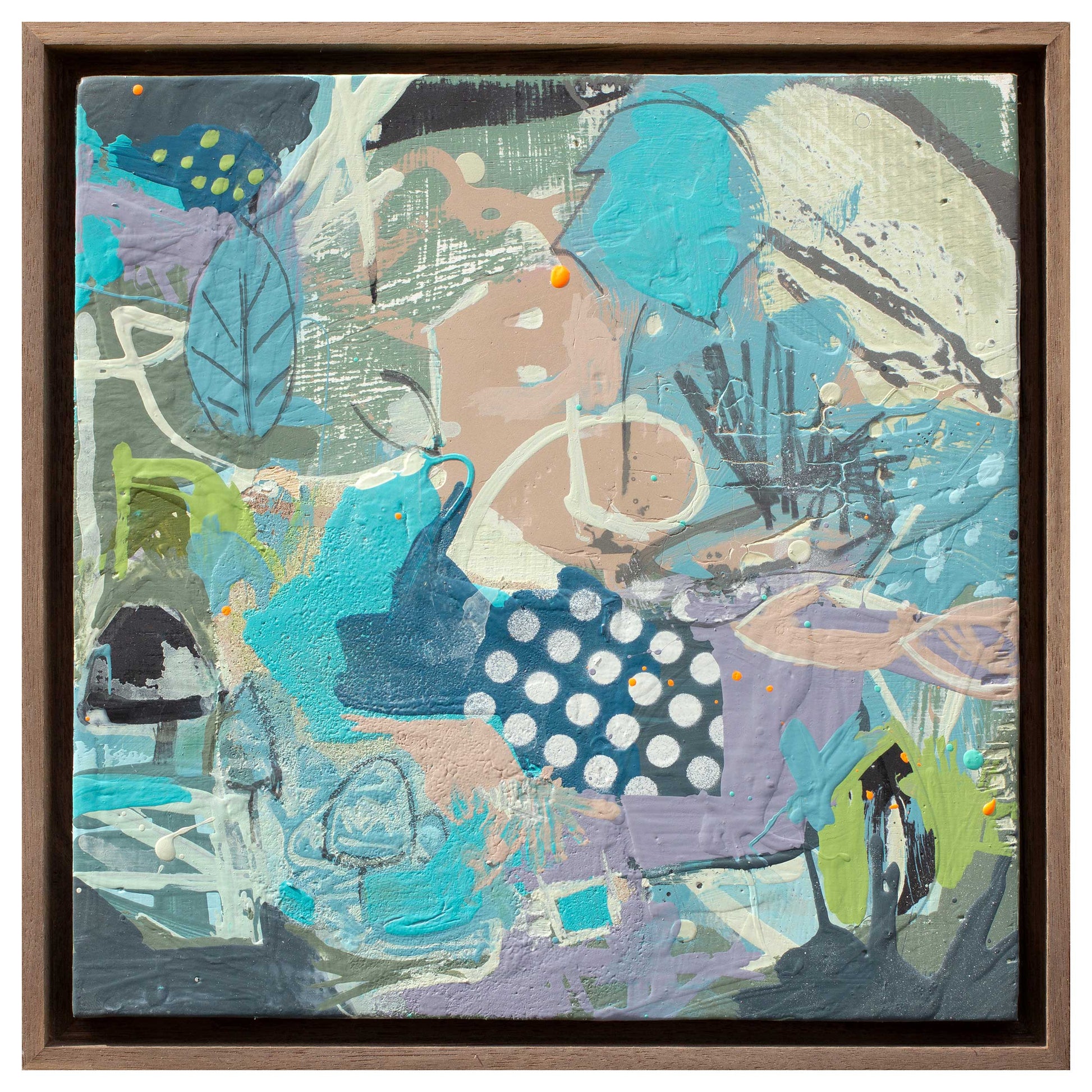 This is an original, mixed media painting on panel, framed in a natural walnut floating.
