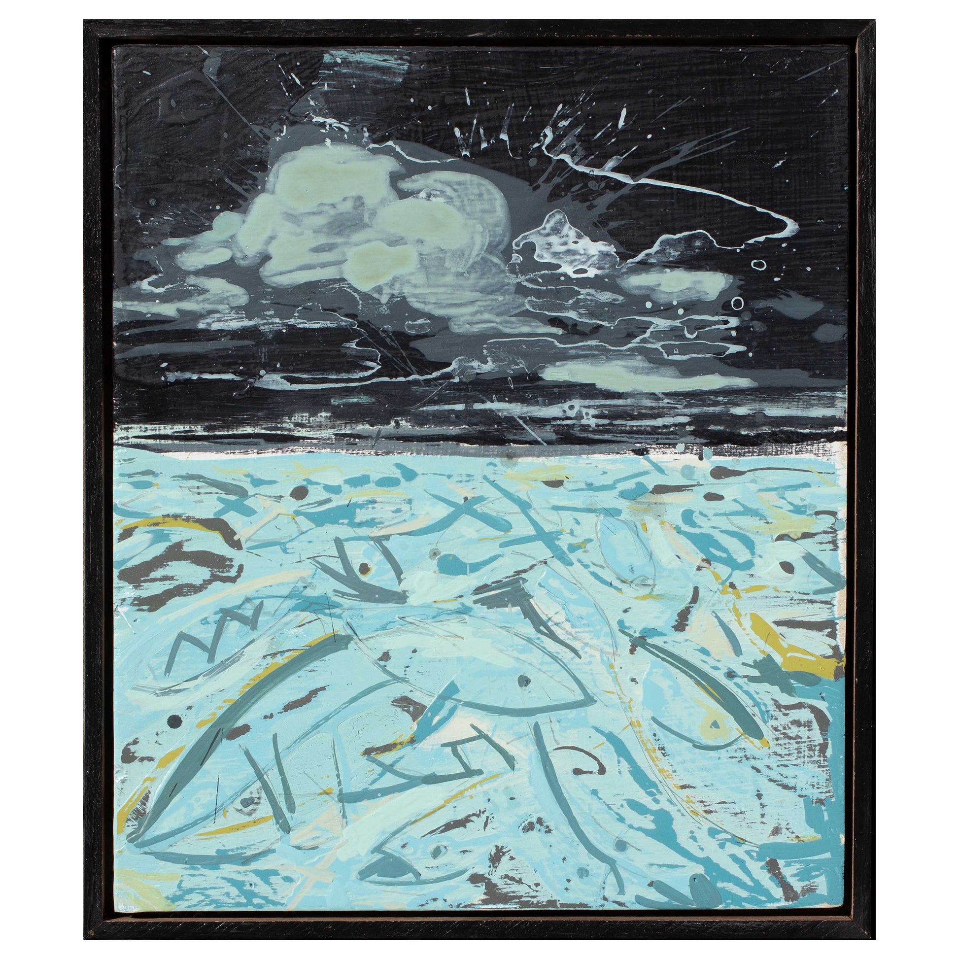 This is an original, mixed media painting on panel, framed in a natural walnut floating.