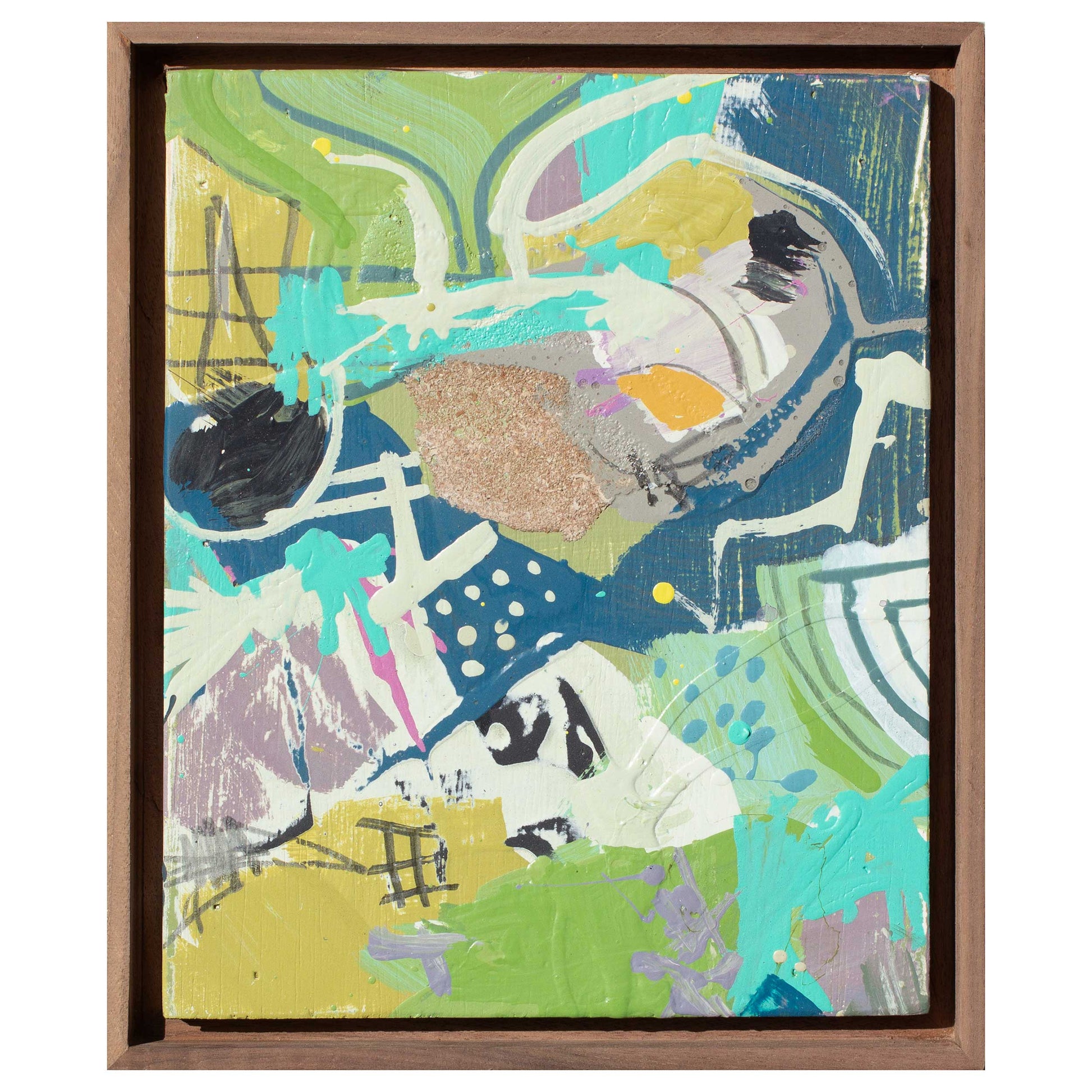 This is an original, mixed media painting on panel, framed in a natural walnut floating.